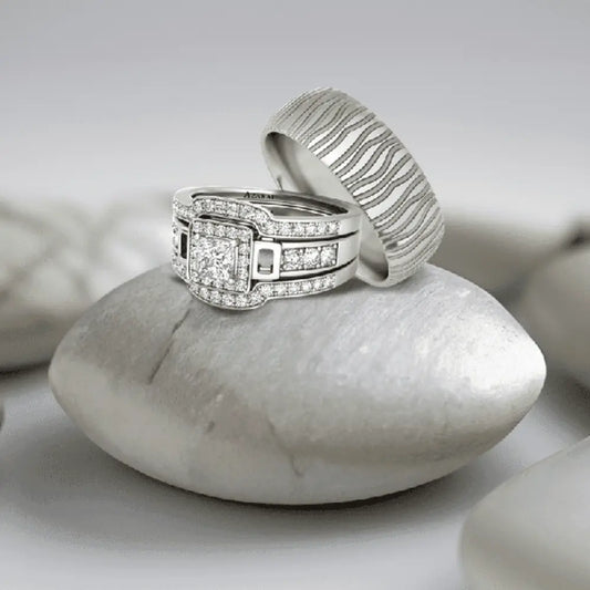 Valea sterling silver bridal set and Windsor titanium wedding band to make a complete trio set. This luxurious and contemporary trio set seamlessly complements any look, making it the perfect choice for your special day. Thoughtfully crafted with exquisite textures and modern styling, it's...- ₦303,000