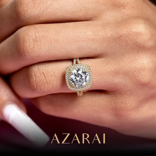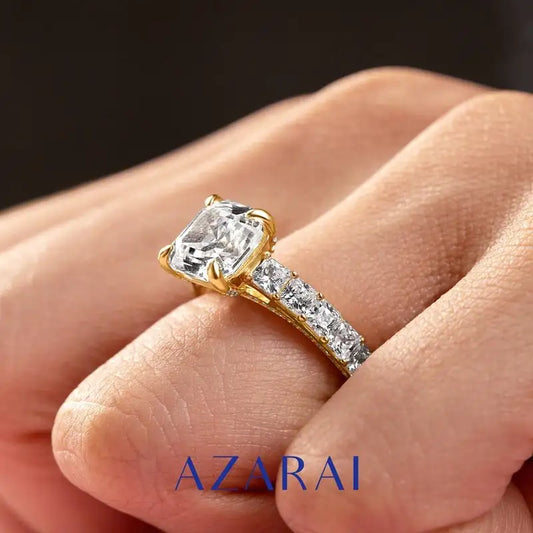 Cressida gold and moissanite engagement ring Available in 9kt, 14kt and 18kt gold Center stone: Yellow MoissaniteCarat: 3 caratCut: Radiant cutTotal carat weight: 3.87 caratsCertificate: GRA- From $1,068.00