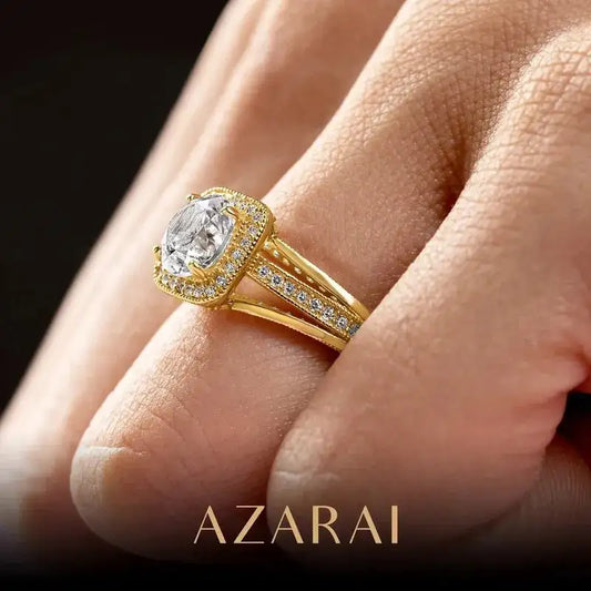Imogen gold and moissanite engagement ring Available in 9kt, 14kt and 18kt gold Center stone: MoissaniteCarat: 2.5 caratCut: Elongated cushionTotal carat weight: 3.33 caratsCertificate: GRA- From $902.00